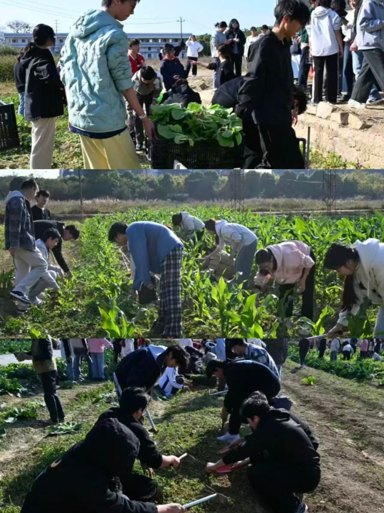 冬日暖阳下,采摘活动如火如荼地进行着。师生们俯身劳作,仔细采收,将沾着泥土气息的新鲜蔬菜细心分拣、打包搬运。田间回荡着欢声笑语,劳动的热情驱散了冬日的寒意。