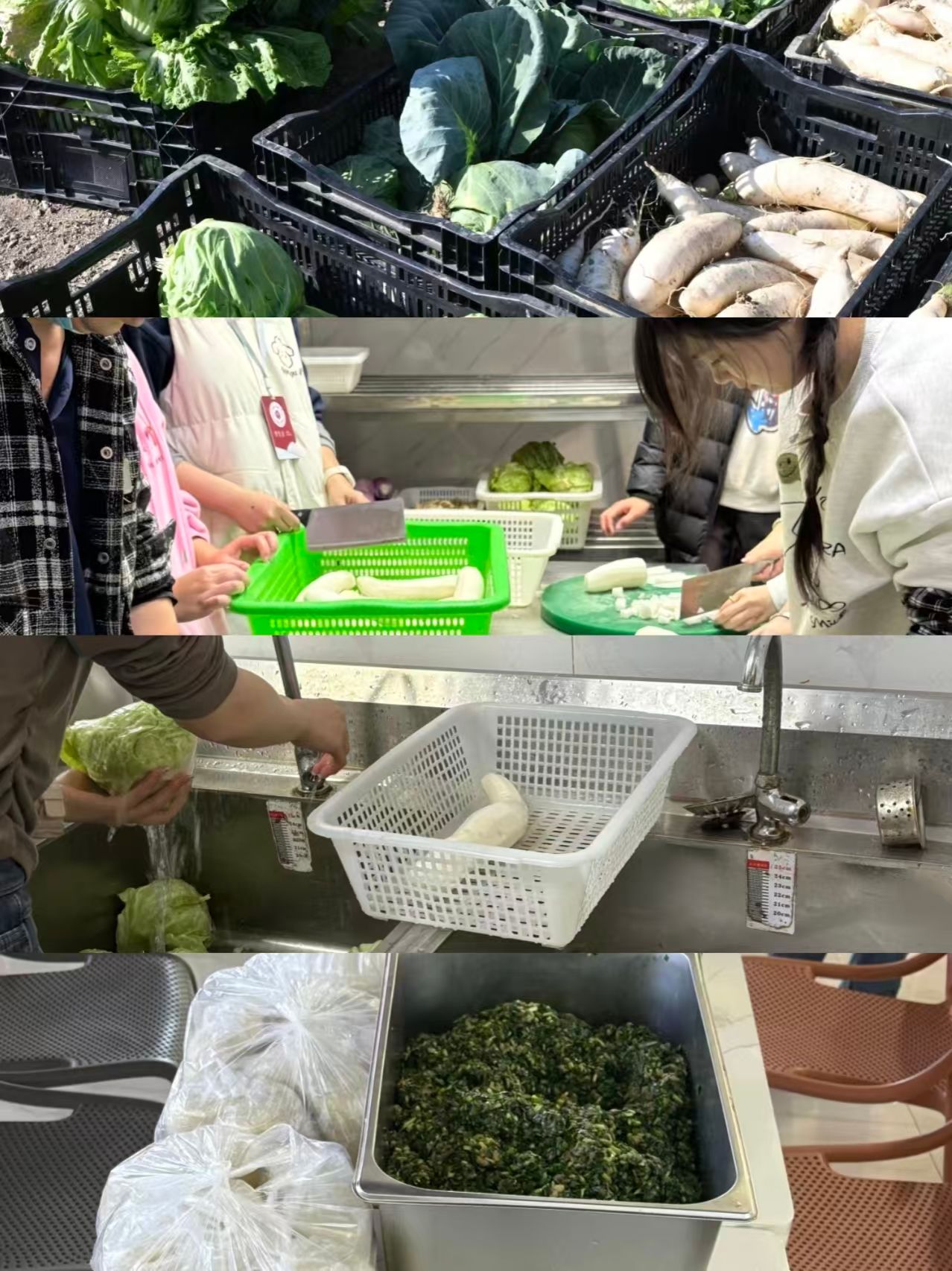 收获的蔬菜被送往食堂进行后续加工。清洗蔬菜、切配蔬菜、拌制饺子馅,各环节在师生协作下有条不紊地进行着。洗菜声、切菜声、欢谈声交织,食堂充盈着温馨的氛围。